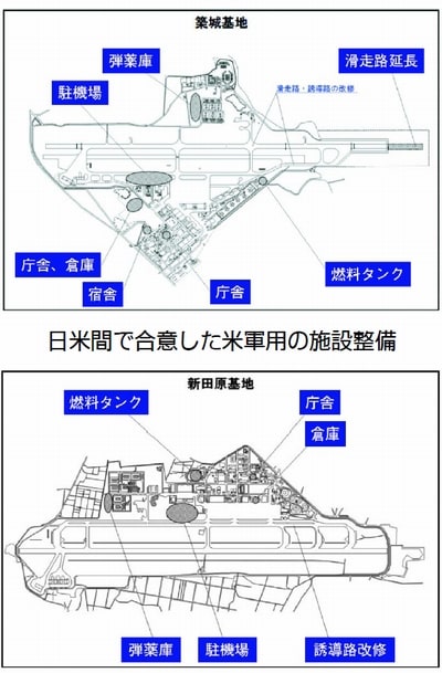 また、普天間基地の「返還期限」とされている2022年度までの整備を計画。築城基地では滑走路(約2400メートル)を約300メートル延長し、宿舎の整備と合わせ米軍の常駐化を狙っています。