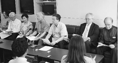 ![]() (写真)米軍機の上空飛行の中止を求める要請について説明する大学の学長ら=26日、沖縄県庁 |