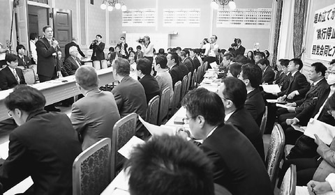 ![]() (写真)辺野古埋め立て承認撤回の執行停止に関して開かれた野党の抗議集会で発言する謝花喜一郎沖縄県副知事(左奥)=30日、国会内 |