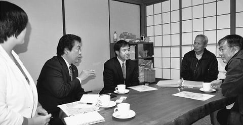 ![]() (写真)萱野(右)、守屋(その左)の両氏と懇談する(中央から左へ)森脇、仁比、すみよりの各氏=20日、岡山市北区 |