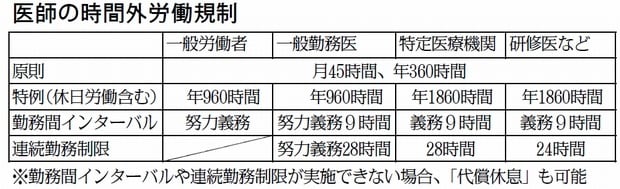 一方、地域医療の確保を理由に、特定の医療機関の勤務医や、集中的に経験を積む研修医や高度な技能を学ぶ医師は、「年1860時間」まで容認します。