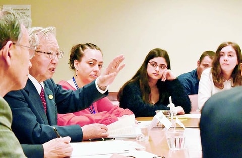 ![]() (写真)ヒバクシャ国際署名のイベントで被爆者の証言を聞くピークの青年たち=3日、国連本部内(池田晋撮影) |