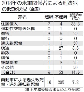 日本で昨年発生した米軍関係者による一般刑法犯の起訴率が約14・5%にとどまり、8割超が不起訴処分になっていることが、日本平和委員会が情報公開で入手した資料で明らかになりました。全国での一般刑法犯の起訴率(2017年)の37・4%と比較して大幅に低下しています。
