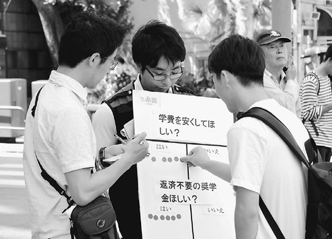![]() (写真)学費問題のシールアンケートに応じる学生=30日、東京・JR御茶ノ水駅前 |