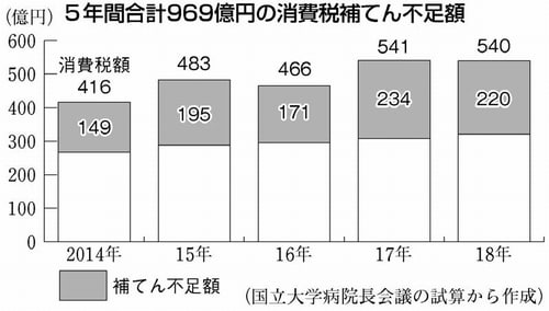 全国の国立大学病院でつくる「国立大学病院長会議」が2014~18年の補てん不足額を試算。今年10月の消費税10%への増税で、さらなる病院経営の悪化につながる懸念が強まっています。