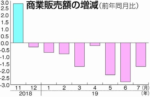 国内消費は低迷しています。8月30日に発表された7月の商業動態統計調査(速報)によると、卸売・小売合わせた商業販売は前年同月比1・7%の減少でした。商業販売が前年同月を下回るのは8カ月連続です。業態別に見ても、百貨店は9カ月連続、スーパーは4カ月連続で前年同月を下回りました。