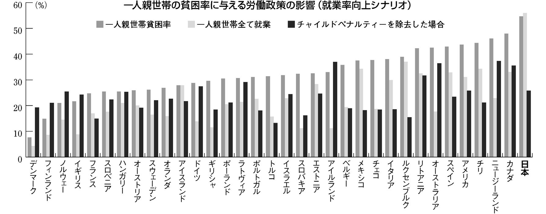 そしてもうひとつ。シミュレート後のグラフです。すべての一人親が仕事をした想定のシナリオでは、どの国も貧困率は大きく改善します。しかし日本だけが、逆に悪化するのです。(54・7%→56%)