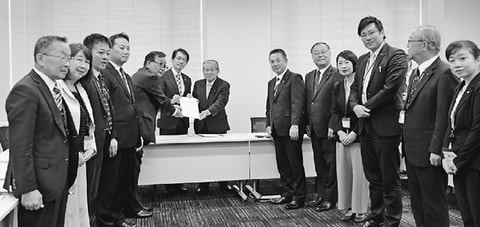 ![]() (写真)桜島火山活動対策議会協議会の代表から要望書を受け取る田村(左から6人目)と赤嶺(同7人目)の両氏=16日、衆院第2議員会館 |