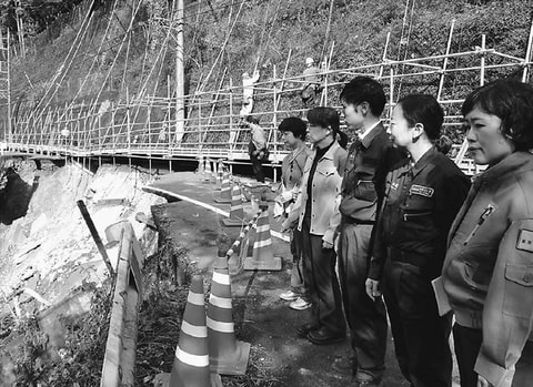 ![]() (写真)都道が崩落した現場を調査する(左から)河野、大沢、山添、吉良、米倉の各氏=19日、東京都奥多摩町 |