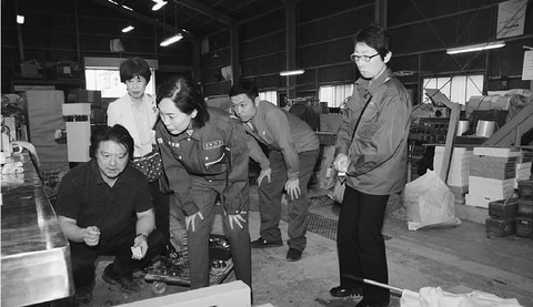 ![]() (写真)岩永さん(左端)から被害について聞く(右から)大庭、市古、畑野、君嶋の各氏。左手前は浸水で故障し修理中の機械=19日、川崎市中原区 |