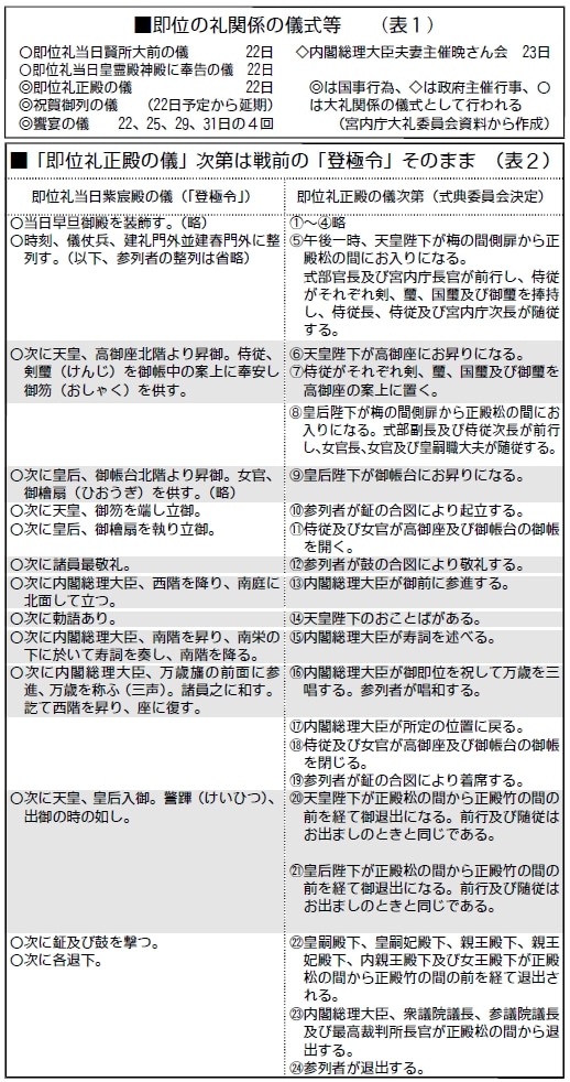 「即位礼正殿の儀」は、戦前の登極令の「即位礼当日紫宸殿(ししんでん)の儀」の名前をかえただけのものです。登極令の儀式の次第と、安倍晋三首相が委員長を務める政府の「式典委員会」が決めた式次第を対照してみると、両者がまったく同じものであることがはっきりします。(表2)