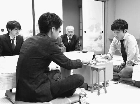 ![]() (写真)増田康宏六段(左から2人目)に勝利し第50期新人王になった高野智史四段(右)。立ち会いの阿部光瑠六段(左)、小木曽陽司「しんぶん赤旗」編集局長(同3人目)=28日、東京・将棋会館 |