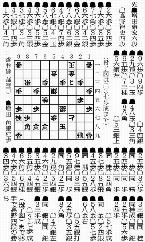 先手の積極的な☗6五歩(33手目)を見た高野四段が長考、31分の考慮で☖7三桂とこの手をとがめ☖4四銀~☖3三角と進んで、今度は増田六段がつづく2手で62分の長考に沈み、変調を思わせました。