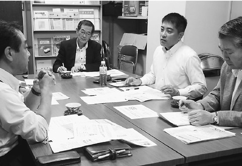 ![]() (写真)志摩委員長(左)らに聞き取りを行う辰巳氏(右から2人目)=29日、大阪市天王寺区 |