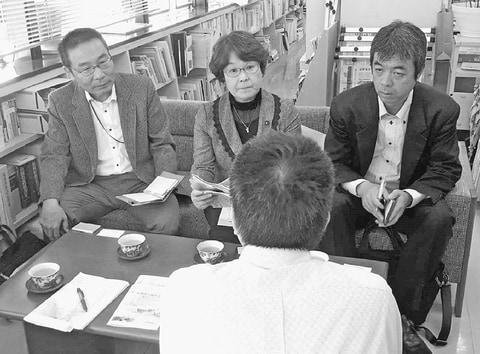 ![]() (写真)福教組で意見交換する高瀬県議(向こう側中央)、小原労働部長(その左)ら=29日、福岡市 |