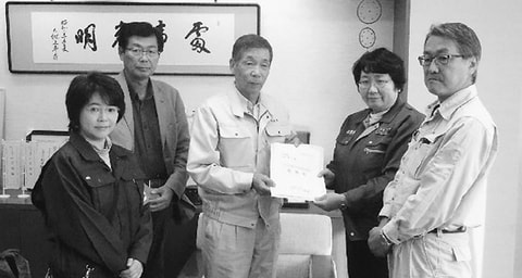 ![]() (写真)保科町長(中央)から要望書を受け取る高橋氏(その右)。左端からふなやま氏、山本氏。右端が金田氏=1日、宮城県丸森町 |