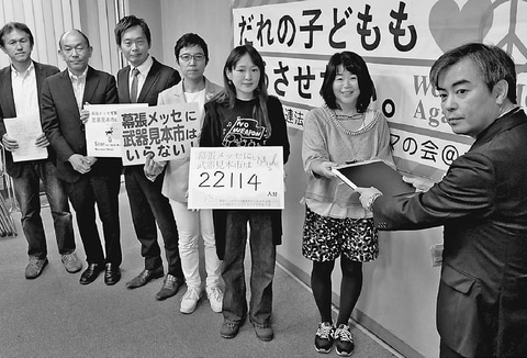 千葉県の「安保関連法に反対するママの会@ちば」と「幕張メッセでの武器見本市に反対する会」などは同県庁で6日、森田健作知事宛てに、幕張メッセ(千葉市)での武器見本市の開催中止を求める署名841人分(累計2万2114人)を提出し、県と交渉しました。