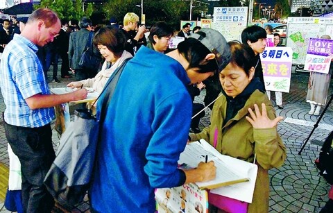![]() (写真)「3000万人署名に協力を」と訴える人たち=7日、東京・新宿駅西口 |