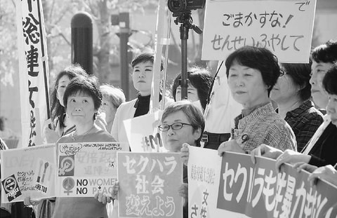 ![]() (写真)「セクハラも性暴力もない社会を」とアピールする参加者=25日、衆院第2議員会館前 |
