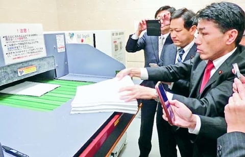 ![]() (写真)資料破棄に使用されたシュレッダーを調査する追及本部の野党議員=26日、内閣府(追及本部提供) |