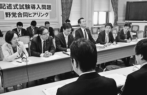 ![]() (写真)記述式試験導入問題の野党合同ヒアリング。左端は畑野君枝衆院議員=12日、国会内 |
