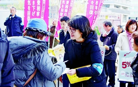 ![]() (写真)消費税の5%への引き下げを求めて宣伝する消費税廃止各界連の人たち=24日、東京・新宿駅西口 |