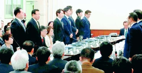 ![]() (写真)「都」構想「協定書」案の方向性を起立し、賛成する維新、公明の議員=26日、大阪府庁 |