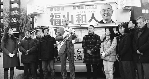 ![]() (写真)「つなぐ京都2020」の共同代表や穀田、山本両氏らと訴える福山候補(中央)=19日、京都市役所前 |