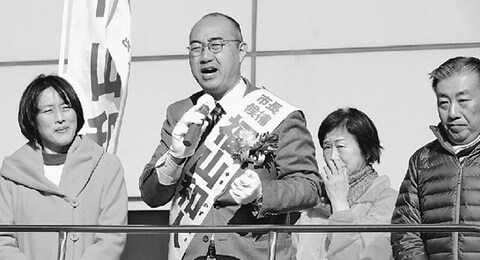 ![]() (写真)街頭から訴える(左から)田村氏と福山候補=19日、京都市南区 |