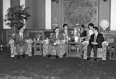 ![]() (写真)胡錦濤政治局常務委員(国家副主席)と会談する不破哲三委員長、志位和夫書記局長=1998年7月20日、北京市・釣魚台国賓館 |