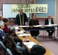 冒頭、工藤良任・般若寺住職は「イラクをめぐり世界中で戦争やめよと運動がおきている時期にこの会が結成されるのはとても重要」とあいさつ。藤井聖仁師(浄土真宗本願寺派僧侶)が結成までの経過を報告しました。会の目的として「日本共産党を支持するとともに、宗教人と日本共産党との対話と共同を発展させるかけ橋となること」を申し合わせました。