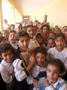 バグダッドから西に五十キロの町、ファルジャ。アルカエド小学校(全生徒約千五百人)の校庭に集まった女子生徒たちにカメラを向けると、十歳前後の彼女たちが一斉に叫びました。