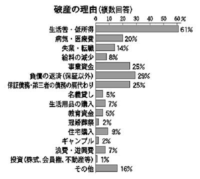 破産申立者が多重債務を負担するに至った理由(複数回答)で最も多かったのが「生活苦・低所得」61%で、前回二〇〇〇年七月の調査の51%を10ポイント上回りました。