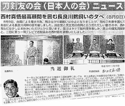 二〇〇二年十二月号では東京・永田町の星陵会館で開かれた「西村真悟代議士を囲む夕べ」を、二〇〇三年十月号では「西村真悟最高顧問を囲む長良川鵜飼いの夕べ」を写真つきで特集。西村議員が元秘書の市議候補を引き連れて村上容疑者らと対談し、支援を要請したこともありました。