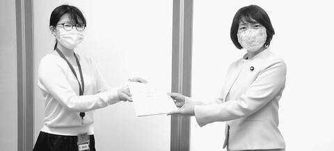 ![]() (写真)青年生活実態調査と要請書を手渡す民青の中山副委員長と、受け取る共産党の田村副委員長・政策委員長=27日、参院議員会館 |