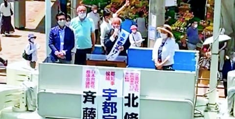 ![]() (写真)斉藤まりこ都議(右)、立民・北条智彦衆院予定候補(左)とともに訴える宇都宮けんじ知事候補(中央)=29日、東京都足立区(宇都宮けんじ広報配信動画から) |