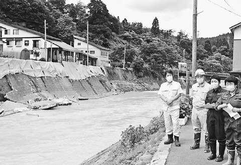 ![]() (写真)銅山川のえぐられた護岸を視察する(右から)高橋、岩渕、佐藤、関の各氏=30日、山形県大蔵村 |
