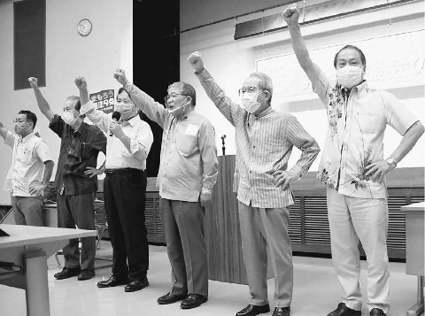 ![]() (写真)頑張ろう三唱で団結を固める、あかみね議員(右から3人目)ら=17日、沖縄県豊見城市 |