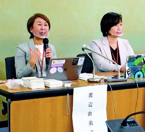 ![]() (写真)支援した子育て世帯から寄せられたハガキを前に話す渡辺理事長(左)=13日、厚生労働省 |