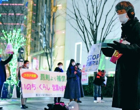 ![]() (写真)コロナ対策について、菅政権は「罰則より補償を」とアピールする参加者=22日、東京都千代田区 |
