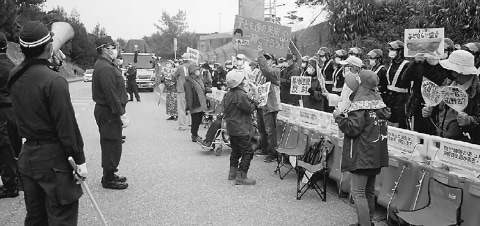 ![]() (写真)連日30~60人が座り込んだゲート前での抗議行動=24日、沖縄県名護市 |