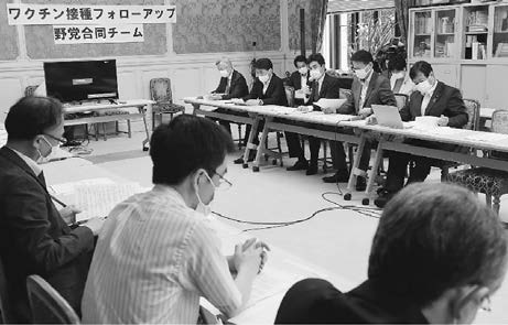 ![]() (写真)「ワクチン接種フォローアップ野党合同チーム」のヒアリング=14日、国会内 |