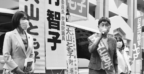 大山候補は小学生から「オリパラ見るよりプールで遊びたい。夏休みはおばあちゃんの家に行きたい」との声が寄せられたことを紹介し、「子どもたちの日常をはやく取り戻したい。五輪を中止しコロナ対策に集中するために勝たせて」と訴え。