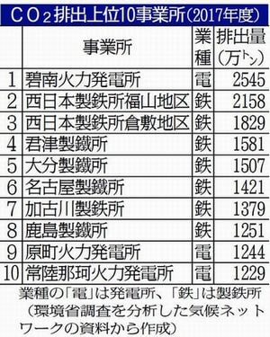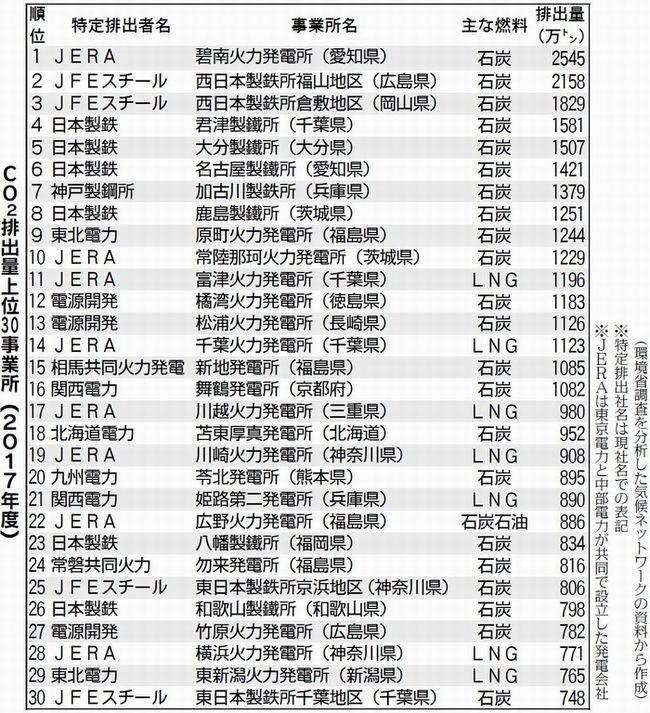 もっとも排出量が多い事業所は、石炭を利用するJERAの碧南火力発電所(愛知県碧南市)です。この発電所だけで日本全体の2%にあたるCO2を排出。家庭からの排出量の636万世帯分にあたります。上位30事業所のうち石炭火発が11事業所を占めています。