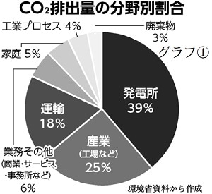 CO2排出を削減するためには電力事業と産業界でのとりくみが重要です。環境省の資料によると、CO2排出量の分野別割合は発電所(電力事業)で39%、工場などの産業が25%を占めています。(グラフ①)