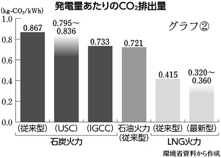 環境省の資料によると、CO2排出係数(発電量あたりのCO2排出量)は0・733~0・867となっており、液化天然ガス(LNG)を使った火力発電の0・320~0・415の2倍にも及びます。(グラフ②)