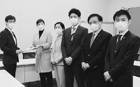 ![]() (写真)国交省の担当者に「リニア提言」を提出するもとむら氏、畑野氏、武田氏、井上氏、山添氏=13日、国会内 |