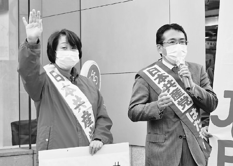 北海道の日本共産党の衆院比例議席奪還を何としてもと、はたやま和也元衆院議員、伊藤りち子の両比例予定候補は、札幌市繁華街の街頭で訴えました。ビラを受け取り、信号待ちで読む人や、自転車を止め、「頑張って」と、はたやま氏と肘タッチを交わして激励する人がいました。