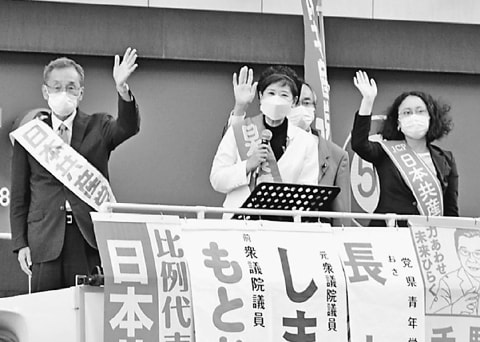 ![]() (写真)比例は共産党」と訴える(左から)しまづ、もとむら、長内の各氏=14日、名古屋市中村区 |