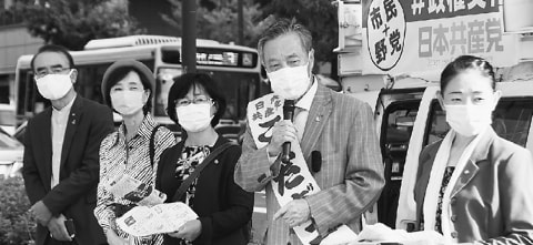 こくた予定候補は、「コロナ禍の下、保健所や応援に入る職員は大変な苦労をしている。住民の暮らしも、女性を中心とする非正規雇用労働者にしわ寄せがいくなどジェンダー不平等の深刻さが浮き彫りになり、観光業や伝統産業などの生業(なりわい)は落ち込んでいる」と指摘。「地方自治を壊し、公衆衛生と社会保障切り捨ての自公政治を市民と野党の共闘で変えよう。共闘の発展に力を尽くしてきた共産党を近畿比例で4議席へと伸ばし、京都1区では、ただ一人の野党の候補の私の勝利へ、お力をお貸しください」と訴えました。